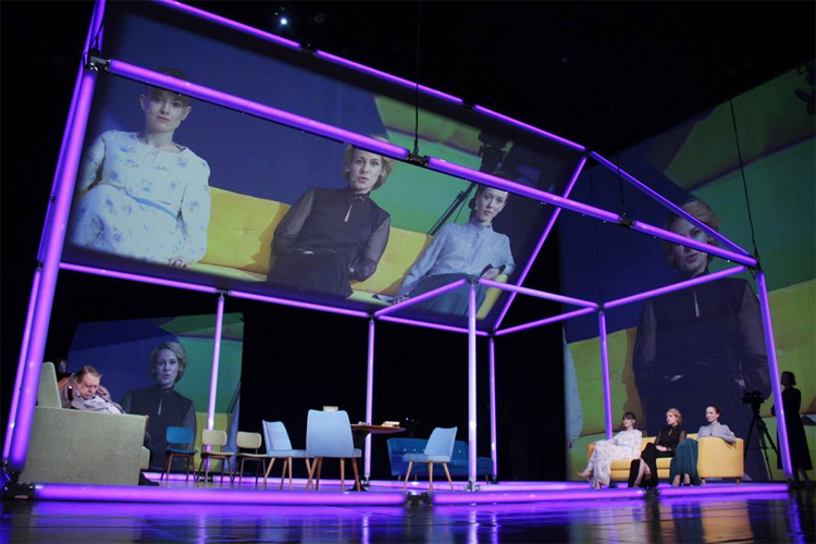 В итоге Ломакина постоянно должна совмещать две задачи: нужно найти спектаклю правильную среду — и грамотно развесить экраны, чтобы превратить их в элементы композиции. Так вот, нигде в ее совместных с Богомоловым работах вы не найдете столь изящного, лаконичного решения обеих этих задач, как в «Трех сестрах»: экран и декорация здесь — одно целое. Неоновую конструкцию с трех сторон окружают непривычно большие экраны, заменяя контурному домику стены. Как результат, актеры, попадающие в кадр, становятся фоном для самих себя.