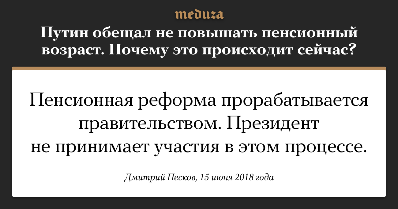 Пресс-секретарь президента Дмитрий Песков сказал, что повышение пенсионного возраста (самая непопулярная мера властей, какую только можно представить) — это не идея Путина, всем занимается правительство.