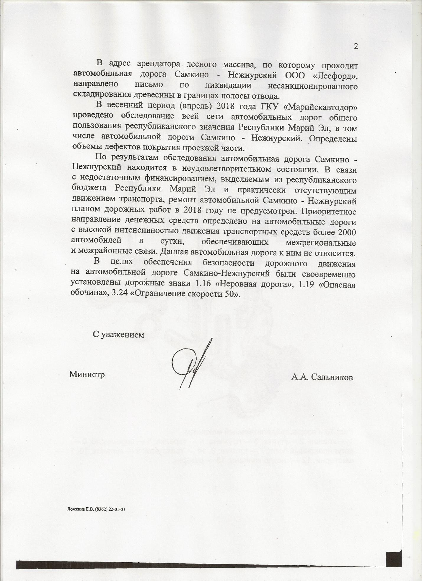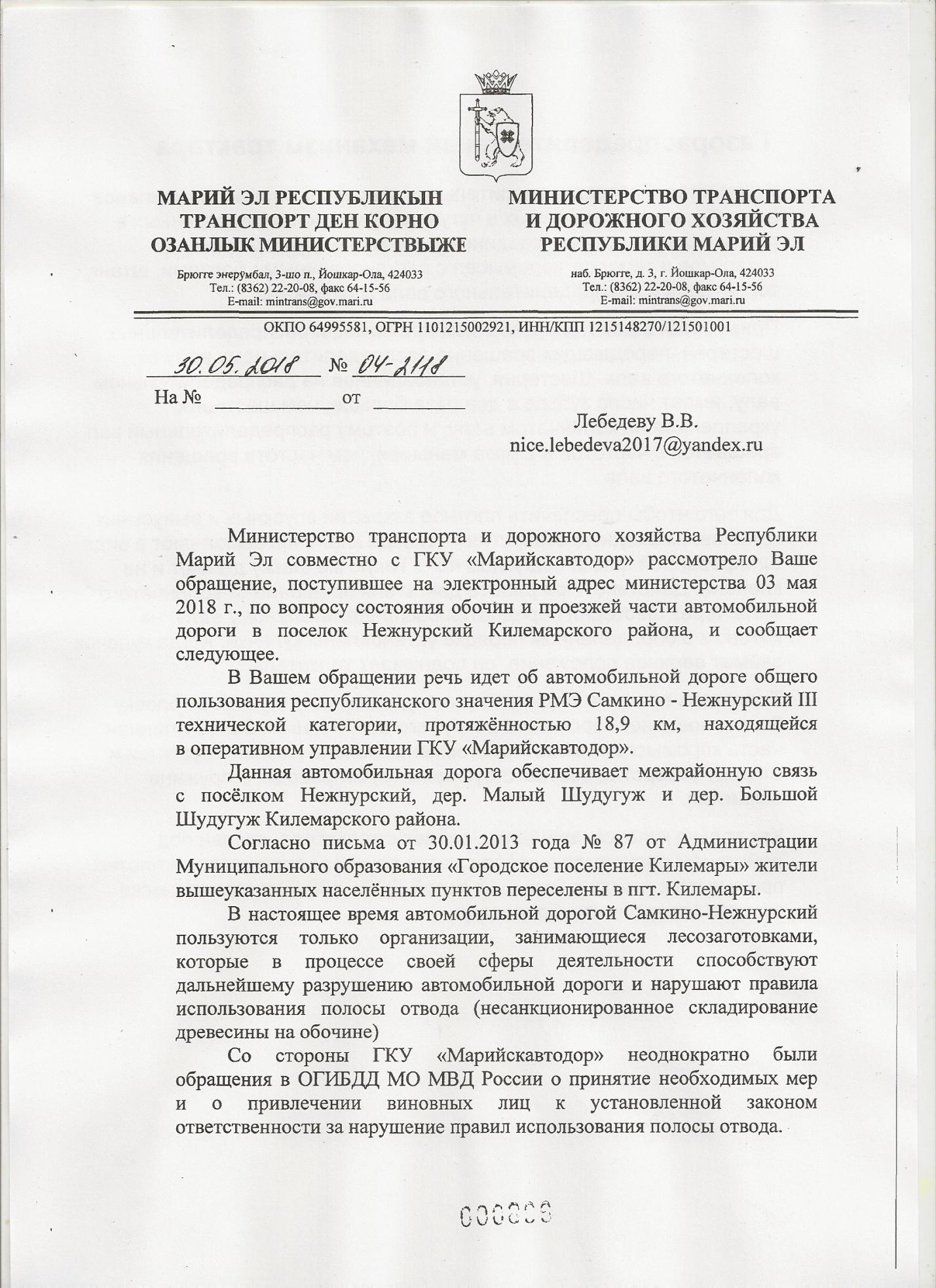 Устав смотреть на беспорядок на дороге Самкино – Нежнурский, я сделал фото и видео данной дороги и обратился в Министерство транспорта и дорожного хозяйства республики Марий Эл.