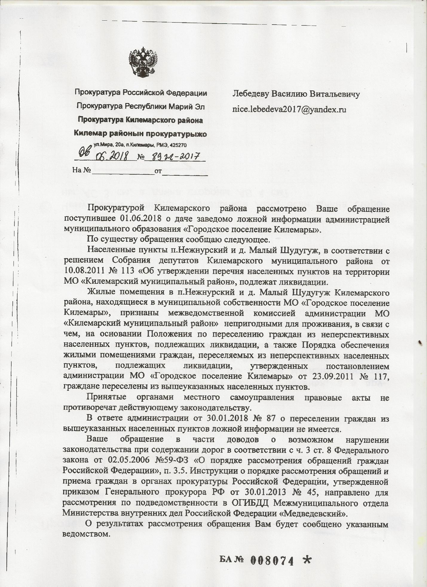 В ответе прокуратуры три раза упоминается, что посёлок «подлежит ликвидации». Они не пишут о переселении, хотя в своем ответе ссылаются на тоже письмо от 30.01.2013 года №87. То есть прокуратура признает, что там есть люди, и что данные населенные пункты нельзя назвать переселенными. Если бы так, то они также ответили, как и министерские, что из данных населенных пунктов люди переселены. Почему такие нестыковки в ответах? Поселки все же переселены или нет? Если да, то почему там прописаны люди и, почему их не обеспечили положенными квадратными метрами в пгт Килемары? Имели ли право отключать свет и не поддерживать дорогу Самкино –Нежнурский в надлежащем состоянии? Почему людей бросили на самовыживание, я даже больше скажу, на изживание из данных населенных пунктов? Ответы, присланные мне, больше напоминаю перекладывание ответственности «с больной головы на еще более больную голову». Куда все же денут людей прописанных в этих населенных пунктах, и какова их дальнейшая судьба? Я думаю, про них забыли, да и некому за них заступится . Их, как я полагаю, уже списали, и плевать всем на то ,что там будет и, где они должны жить. Меня мучает еще один вопрос, почему наше руководство против того, чтобы данные населенные пункты жили. Чего плохого в том, что там будут жить эти люди? Они не «рвутся» в наш неперспективный, безработный посёлок, за лучшими условиями. Они смогли наладить свою жизнь в родном посёлке. Им нужно только узаконить своё, нужно электричество, которое было, как я считаю, незаконно отключено. Почему жителям нельзя пользоваться этими ресурсами, а Охотхозяйству можно без проблем ?