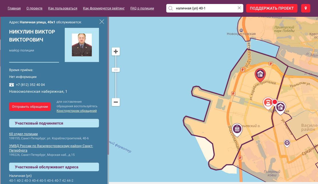 Для начала на сайте сервиса стоит ввести адрес в строке поиска, чтобы найти участкового. Вы сразу увидите анкетную карточку участкового с его контактами, информацией о том, какому отделению или управлению он подчиняется, список всех обслуживаемых адресов, и контакты органов, которые защищают права в случае нарушений со стороны полицейских. Например, прокуратуры или общественного совета. Найти участкового также можно по имени.