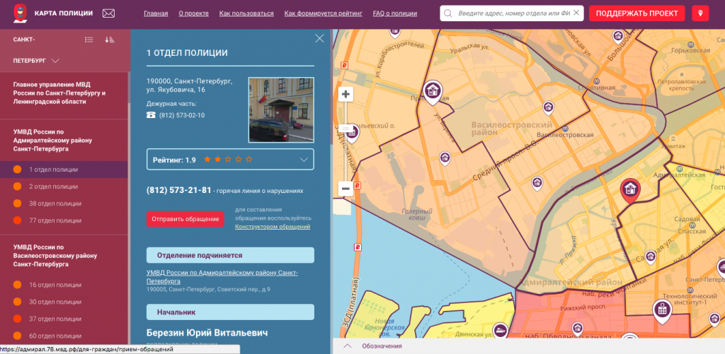 Можно изучить информацию о конкретном отделе, выбрав его на карте. В этой карточке вы найдете номер дежурной части, информацию о начальнике и в какое время он ведет прием, кому и как обжаловать действия его сотрудников. У отделов есть рейтинг, который составлен на основе данных общественного мониторинга, проведенного в 2017 году. В нем оценивалась доступность и информационная открытость участка. Интересно, что к участку прикреплена новостная лента.