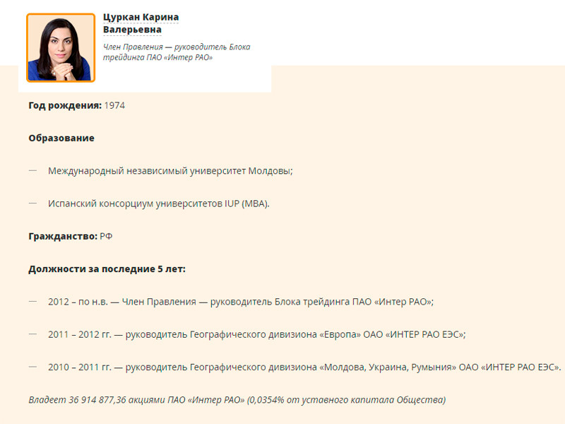 На сайте "Интер РАО" сообщается, что у Цуркан есть гражданство РФ. При этом в компании топ-менеджер отвечала за бизнес холдинга в Молдавии.