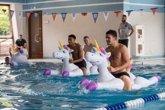 Футболисты сборной Англии катаются на надувных единорогах в бассейне в Репине. Фото