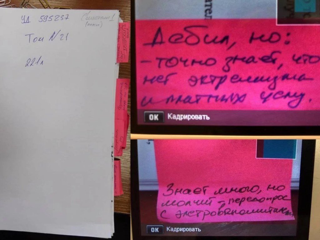Адвокатам петербургских саентологов, задержанных год назад по подозрению в создании экстремистского сообщества, поступили материалы дела для ознакомления. На документах адвокаты нашли стикеры с надписями вроде «Знает много, но молчит, передопрос с использованием электровспоминателя». Фотографии этих надписей публикуют «Медиазона» и РБК.