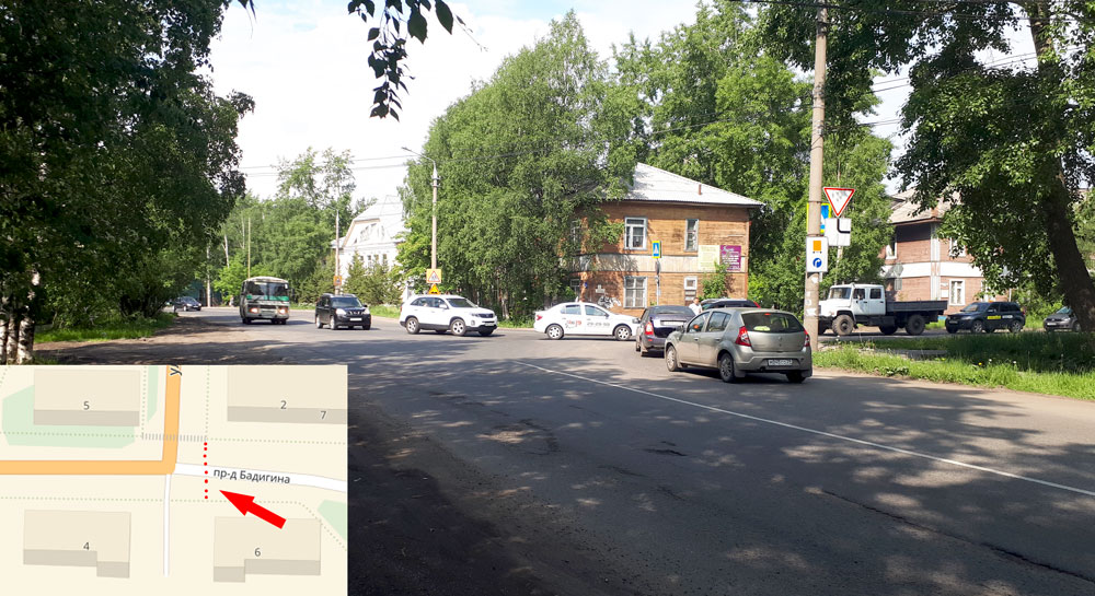 Хорошо бы сделать переход и через Бадигина, со стороны «фотографа». Тут он не будет мешать. Кстати, тут перебегают дорогу идущие по короткому пути, через дворы, от перекрестка Тыко Вылки — Самойло