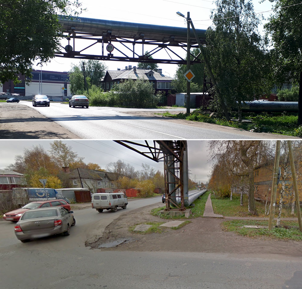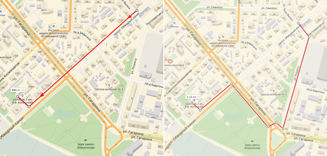 Люди же волнуются. Местные дети учатся в школе № 2, путь в учебное заведение попросту опасен. Конечно, можно обойти проблемный участок, сделав крюк. На карте ниже прямой путь (слева) и «законный», по переходам (справа).