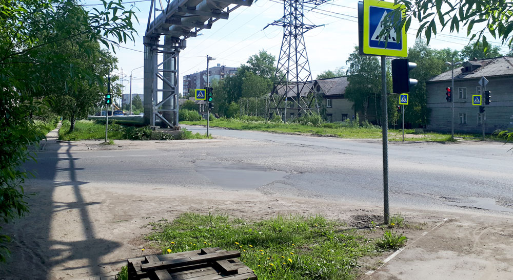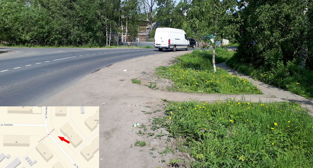 А вот пересечение Тыко Вылки и Самойло. Горожане тут переходят, есть подводящие мостки. Используется обозначенное место активно, ибо за отсутствующим переходом кратчайший путь до автобусной остановки.