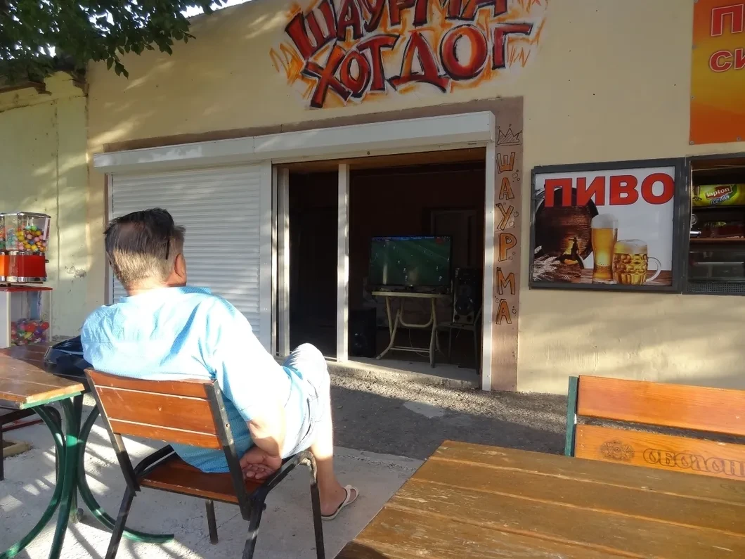 Чемпионат мира я нашел в неожиданном месте: в палатке «Хот-доги, шаурма» у пляжа. Хозяин точки Рустем, наливая лимонад, приглашает меня сесть за стол. За соседним сидят еще трое мужчин.