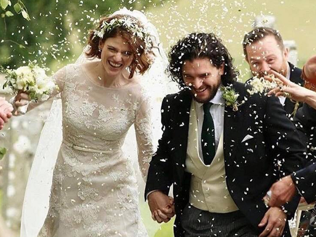 Актер Кит Харингтон, известный по роли Джона Сноу в сериале «Игра престолов», женился на актрисе Роуз Лесли, также снявшейся в сериале, сообщает CNN.