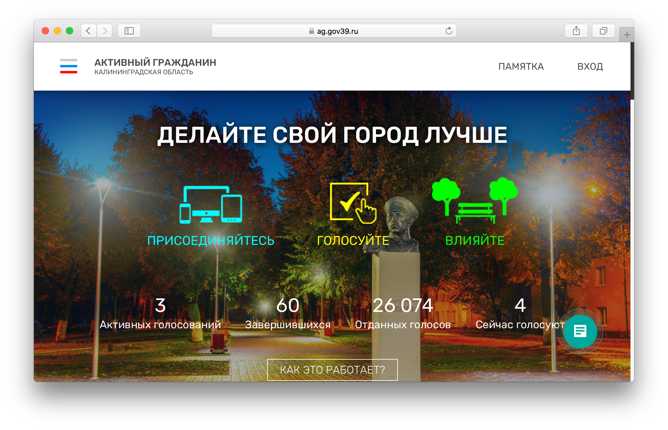 Собственный сайт электронной демократии открылся и в Калининградской области (власть там в 2016 году сменилась дважды). На нем прошло уже 60 голосований. В одном из них — о строительстве летнего театра в Багратионовске — поучаствовали три человека. В другом — о благоустройстве дворов рядом с фан-зоной чемпионата мира — пока ни одного.