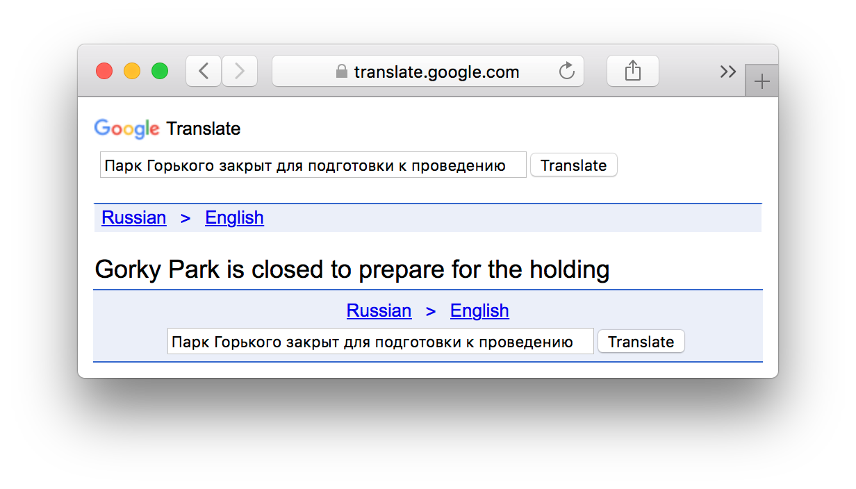 Можно предположить, что во всем виноват Google Translate. Но он умеет правильно переводить Парк Горького — если написать фамилию писателя с прописной буквы.