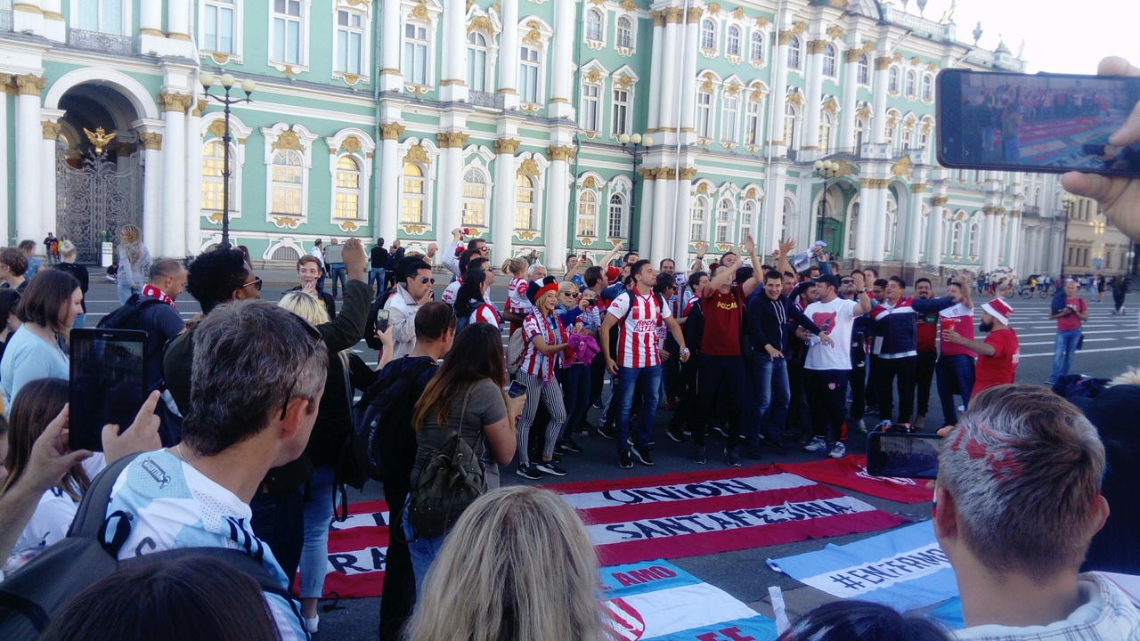 Болельщики сборной Аргентины собрались вечером 25 июня на Дворцовой площади и начали петь и плясать. Они взяли с собой флаги страны, а также банеры с изображением Месси — капитана национальной сборной Аргентины.