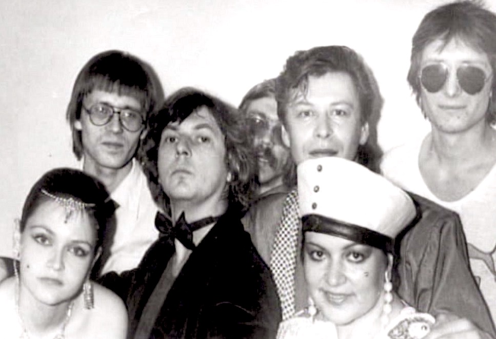 Весна 1984-го, Ленинградский рок-клуб, 2-й рок-фестиваль, гримерка группы «Зоопарк» перед выступлением. Верхний ряд слева направо: я и Андрей Данилов (барабаны). Нижний ряд слева направо: Евгений Губерман (барабаны), Майк, Александр Храбунов (гитара) и Михаил «Фан» Файнштейн-Васильев (бас-гитара, «Аквариум»). Фото из личного архива Александра Донских. Автор не установлен.