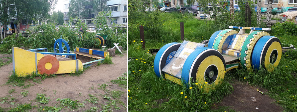 На детские площадке стандартные новые элементы, а также «самиздат». Вроде обычный, но с вниманием к мелочам, посмотрите на машинку.