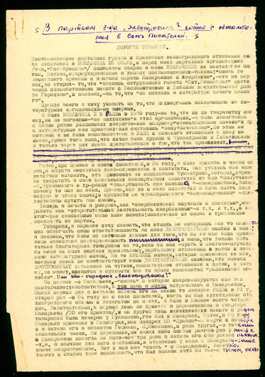 Меня исключили из Союза Писателей «за длительную связь с врагами народа Макарьевым [17] и Авербахом, за несоздание в литературе ничего ценного», а партгруппа к этому присовокупила — «поставить вопрос о пребывании в партии... будучи сотрудницей “Лит<ературного> Ленинграда” фактически, вместе с Беспамятновым и Добиным [18], помогала Горелову [19] проводить вредительскую линию в работе газеты».
