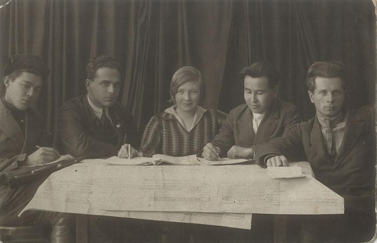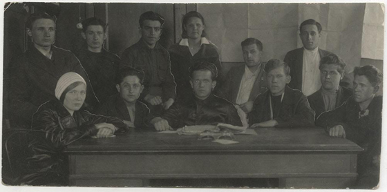 Ольга Берггольц с комсомольцами газеты «Электросила». Ленинград, 1933 4/III.