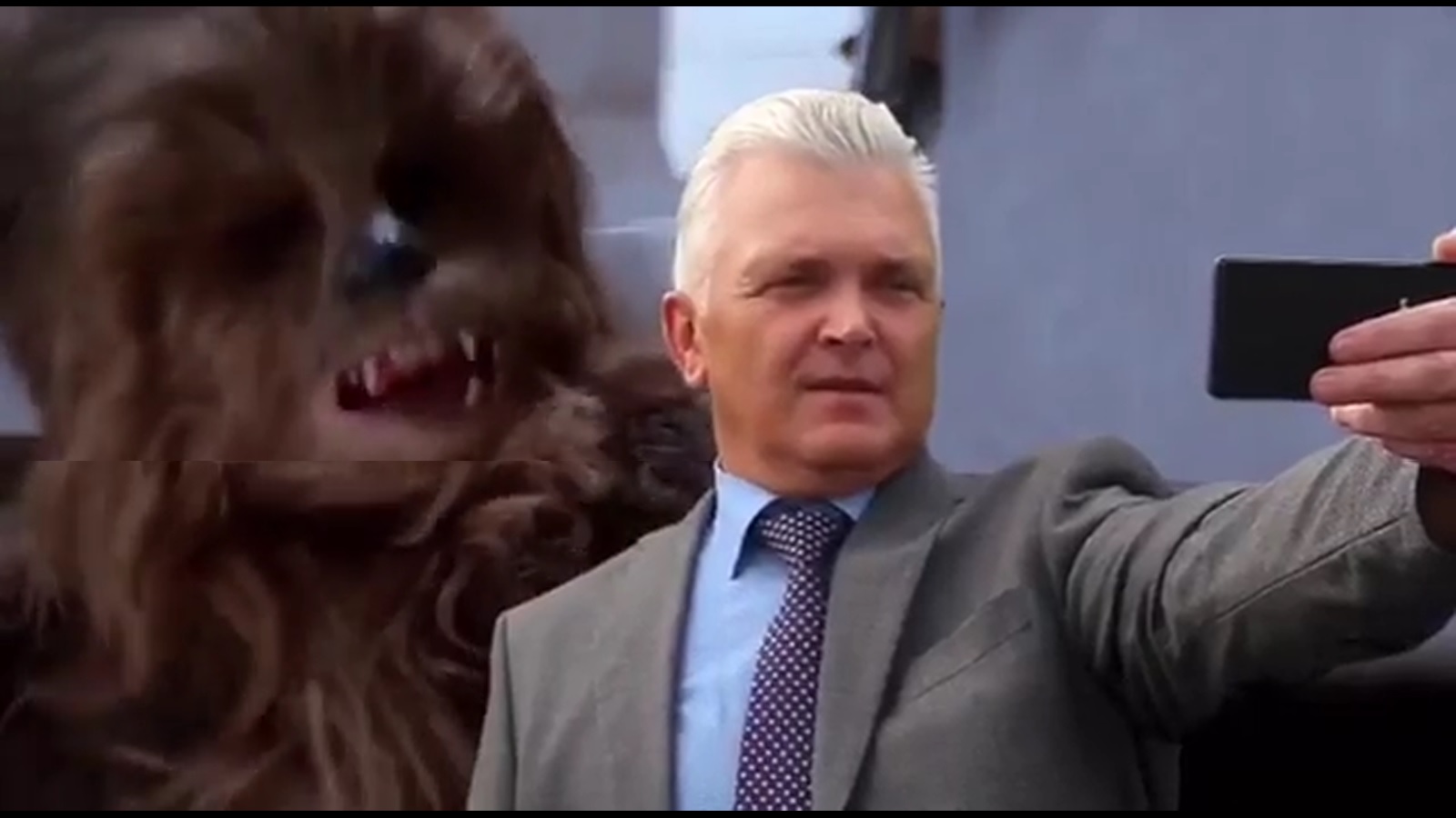 В ролике чиновники фотографируются с Чубаккой, пилотируют космический корабль и спасают магистра Йоду от светового меча Дарта Сириуса. А еще играют на воображаемом рояле, виолончели и барабанной установке. Видео заканчивается поздравлением жителей.