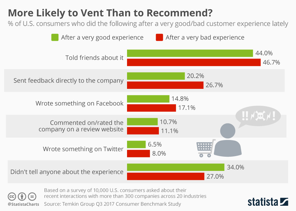 Про «сарафанное радио» среди клиентов нужно всегда обязательно помнить, показывает проведенный в США опрос: почти 50% людей рассказывают знакомым как об очень позитивном, так и об очень негативном опыте использования услуг или товаров какого-либо бренда. Также явно стоит просить клиентов о фидбеке: каждый четвертый не поленится напрямую написать в компанию о том, что ему не понравилось, а каждый пятый — о том, что понравилось. В остальном статистика подтверждает интуитивно понятные вещи: люди очень любят жаловаться в фейсбуке, а о негативном говорят ненамного, но все же стабильно чаще, чем о хорошем: