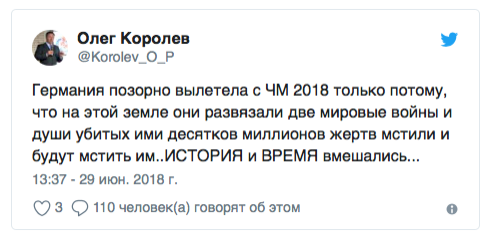 В твиттере губернатора Липецкой области Олега Королева днем 29 июня появилась запись, в которой вылет сборной Германии по футболу с чемпионата мира объясняли местью жертв двух мировых войн.
