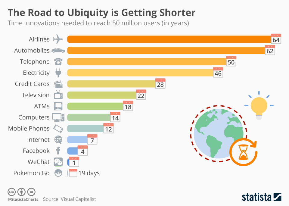 [whatabout text='Будущее гораздо ближе, чем мы думаем. Скорость внедения инноваций ускоряется: если для того, чтобы авиакомпаниями начали летать 50 млн человек, потребовалось 64 года, то интернет охватил такую аудиторию уже за 7 лет, Facebook - за четыре, а игра Pokemon Go - всего за 19 дней.