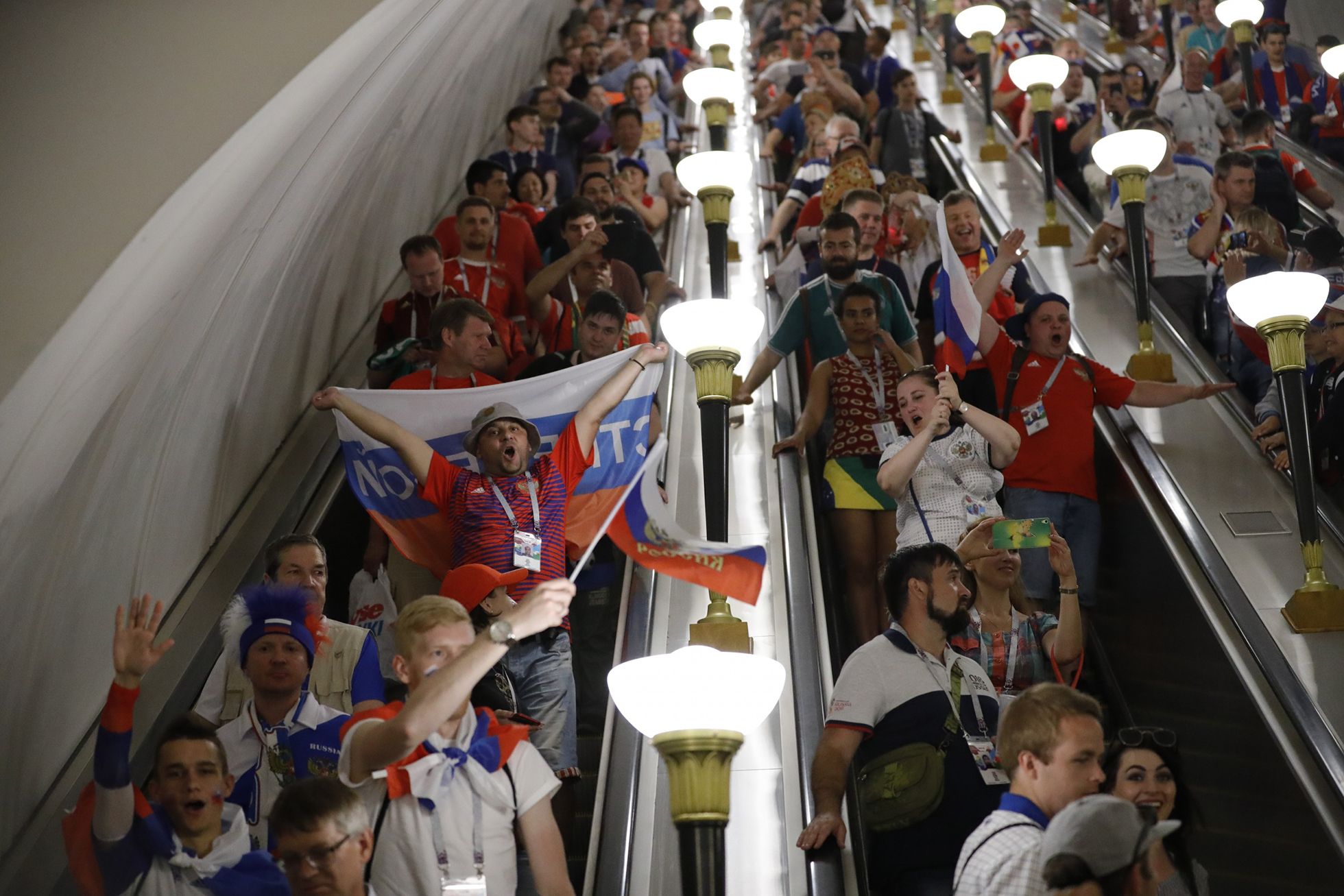 Татьяна Макеева / Reuters / Scanpix / LETA Болельщики в московском метро празднуют победу сборной России над испанцами, которая вывела команду в четвертьфинал чемпионата мира. Сразу после матча в Москве и других российских городах начались гуляния.