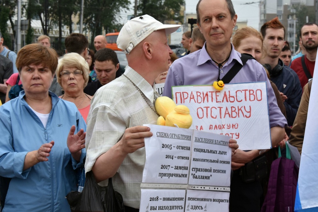 «Я здесь, потому что меня возмутило это решение повысить пенсионный возраст, — цитирует ТВ2 одного из участников, который пришел с плакатов „Пенсионер похоронил Россию“. — Мне 63, я на пенсии. Но я работаю, потому что жить только на пенсию в России нереально. А каково другим, которые только придут к пенсионному возрасту? Особенно жестоко поступают с женщинами. Увеличить женщине пенсионный возраст на 8 лет — это дичайшая ситуация. И эти люди представляют интересы народа. Народ же за них голосовал! За того же нашего президента. Президент обманул своих избирателей. Президент обманул свой народ».