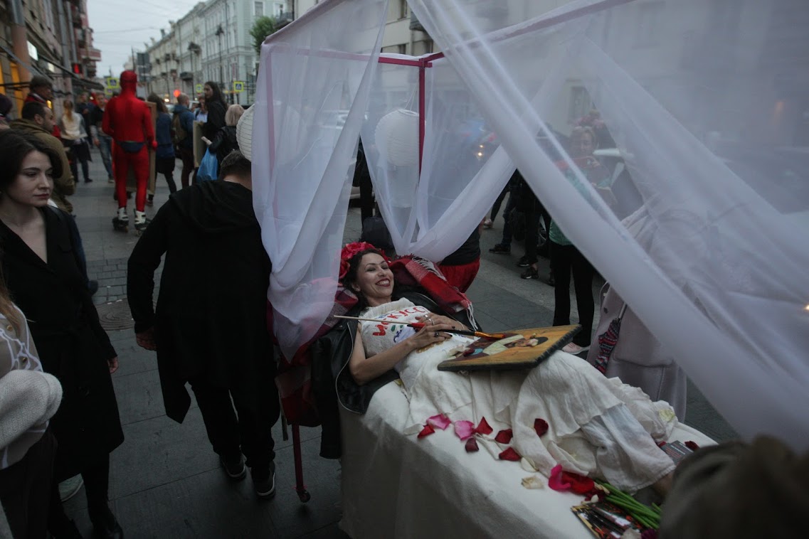 В преддверии аукциона художники провели акцию. Они пронесли по Невскому проспекту розовую кровать, на которой лежала девушка, одетая как художница Фрида Кало. В руках она держала картины, которые будут выставлены на «Искусстве за бухло».