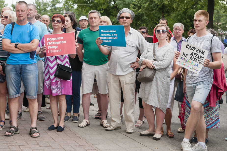 — Администрация города сплела юридические кружева, поверх которых красными буквами чиновники написали: «Мы вам не позволим собираться и выступать против повышения пенсионного возраста», — обратился Александр Зыков к собравшимся. Он раздал желающим небольшие плакаты и российские флаги. Невостребованным оказался плакат с надписью «Прости, бабушка, что голосовал за Путина» — никто не хотел его брать, объясняя, что он не голосовал за Путина.