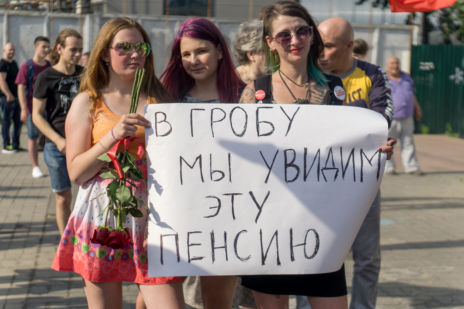 — Люди, которые пришли на митинг, реализуют свое конституционное право на свободу собраний. Я считаю, что это подло — загонять людей под уголовное преследование [после трех протоколов об административном правонарушении рискует стать фигурантом уголовного дела депутат-коммунист Александр Воробьёв]. Согласно «майским указам» президента, принимаемые законы не должны ухудшать положение граждан и проходить стадию общественного обсуждения. Если в течение восьми лет пять раз меняется пенсионное законодательство, то как с этим жить? До сентября у Владимира Владимировича есть время отыграть назад эту реформу. Это типичная двухходовочка — после протестов он смягчит инициативу о повышении возраста.