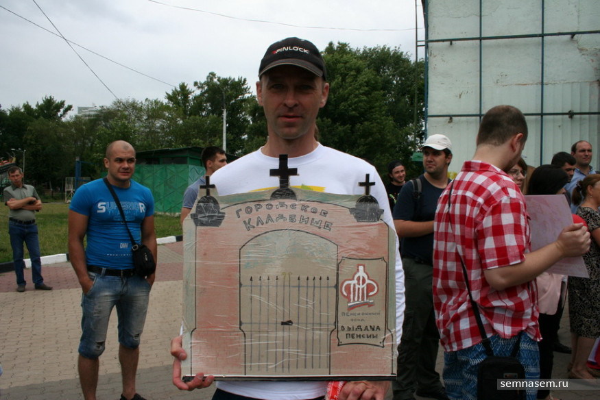 На митинг собралось около двухсот человек, пришли и сторонники Навального, и те, кто не поддерживает политика, но не может не выступить против повышения пенсионного возраста. Один из белгородцев принес плакат с изображением кладбища, на воротах которого он нарисовал логотип Пенсионного фонда: