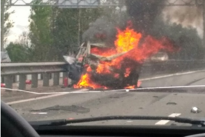 На Пулковском шоссе столкнулись два автомобиля. Одна машина загорелась, есть погибшие