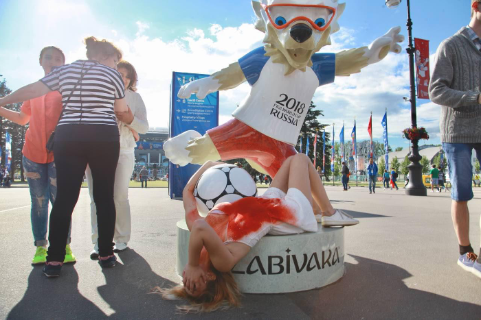 Акция прошла у стадиона «Санкт-Петербург» перед матчем между сборными Швеции и Швейцарии. Девушка в «окровавленном» белом платье лежала у фигуры волка Забиваки.