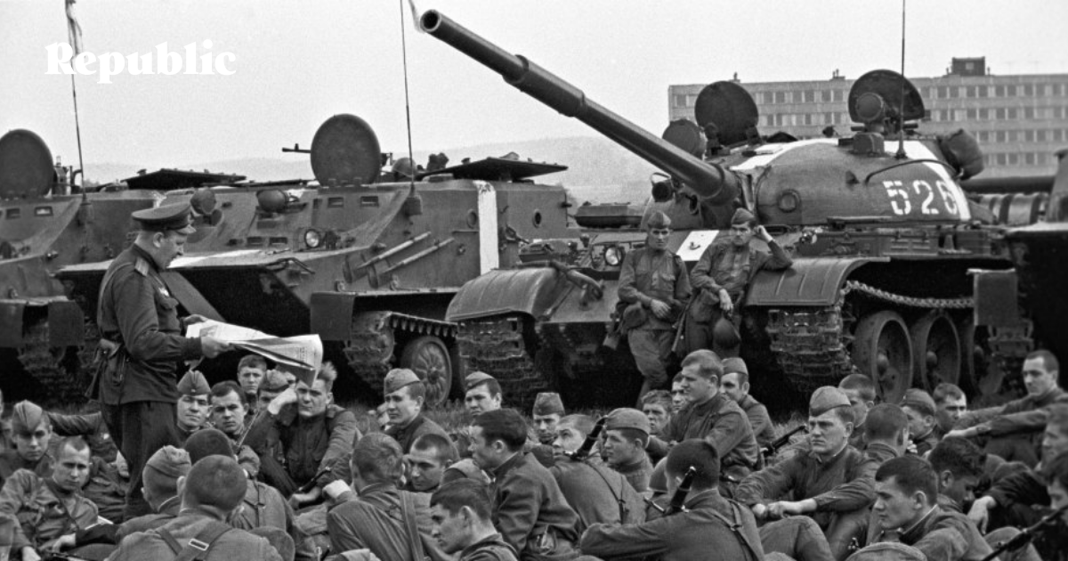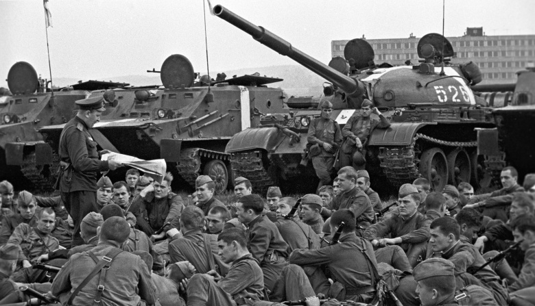 Бойцы одной из частей Советской Армии, введенной на территорию Чехословакии в августе 1968 года, слушают политинформацию. Фото: Валерий Шустов / РИА Новости