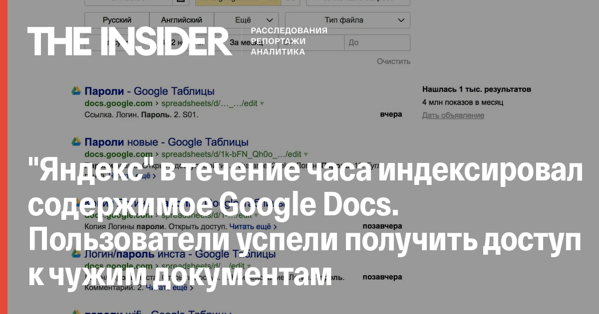 Пресс-секретарь «Яндекса» Илья Грабовский пояснил «Медузе», что «в среду вечером в службу поддержки обратились пользователи с жалобами на проблему доступности файлов на docs.google.com». «Наша служба безопасности связывается сейчас с коллегами из Google, чтобы обратить их внимание на то, что в этих файлах может оказаться приватная информация», — заявил он.