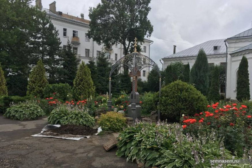 Во дворе Казанского женского монастыря работники Ярославской епархии украсили поклонный крест в память о жертвах восстания металлической аркой. 6 июля ремонтные работы еще не закончились.
