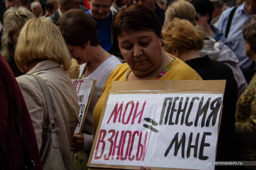 Люди пришли с плакатами, с помощью которых в том числе обращались к президенту: «Президент — держи ответ перед народом!», «Путина на пенсию». Большая часть — с обращением к правительству: «Правительство России — позор России», «Медведев! Как дожить до пенсии? Как прожить на пенсию?».