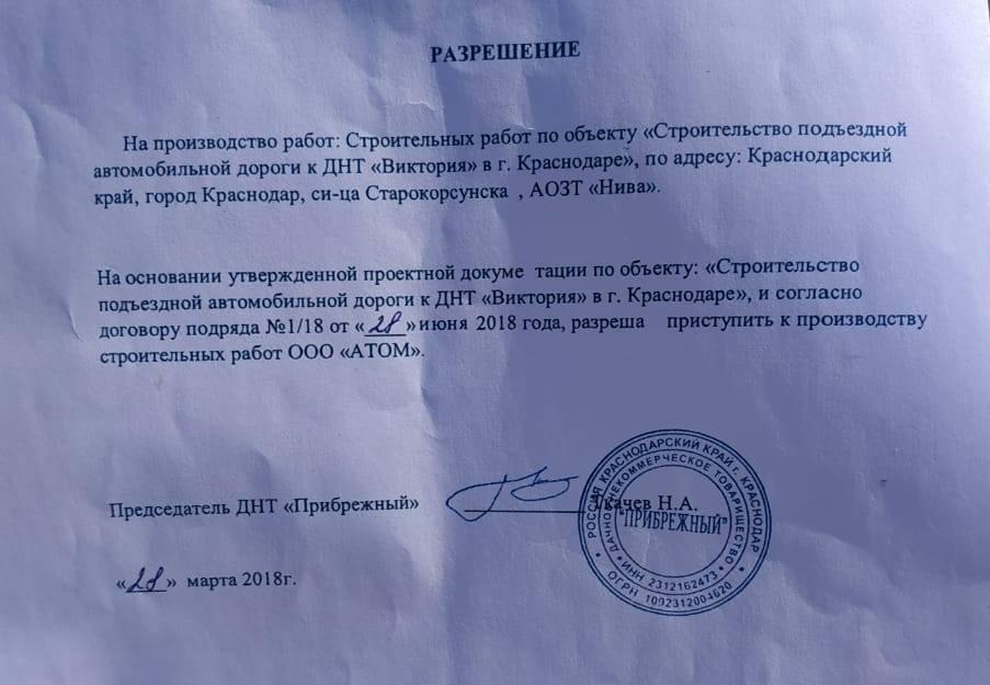 Из этого «документа» следует, что вырубка осуществляется в целях строительства подъездной автомобильной дороги к ДНТ «Виктория» в Краснодаре и что Николай Ткачев разрешает компании ООО «Атом» на основании утвержденной проектной документации приступить к производству работ согласно договору подряда.