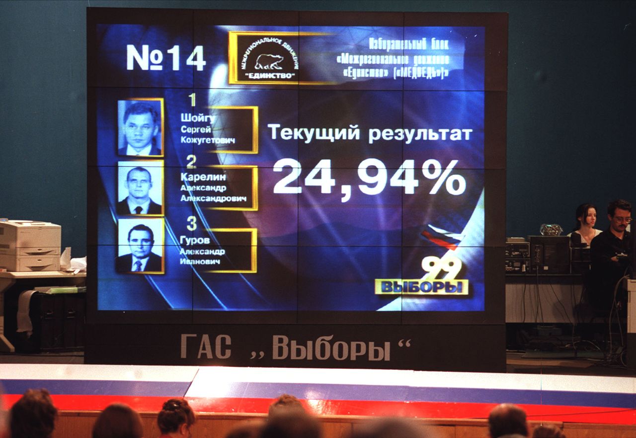 Борис Кавашкин / ТАСС Ночь после выборов в Госдуму в пресс-центре ЦИК. На экране — результат «Единства». Москва, 20 декабря 1999 года