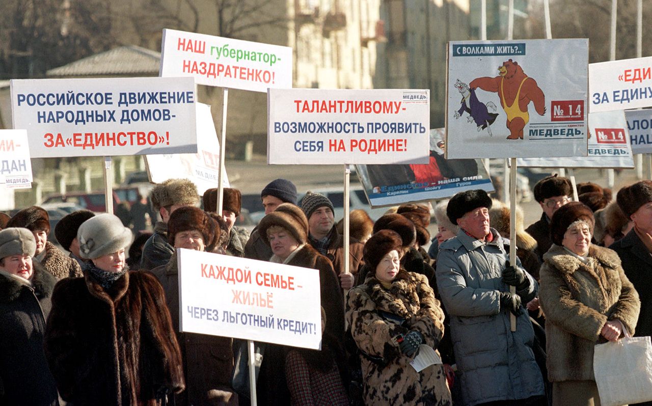 Владимир Саяпин / ТАСС Митинг в поддержку «Единства» во Владивостоке за неделю до парламентских выборов, 12 декабря 1999 года. После митинга «собравшиеся на площади горожане наблюдали за работой спасателей МЧС по ликвидации смоделированной чрезвычайной ситуации на шоссе»