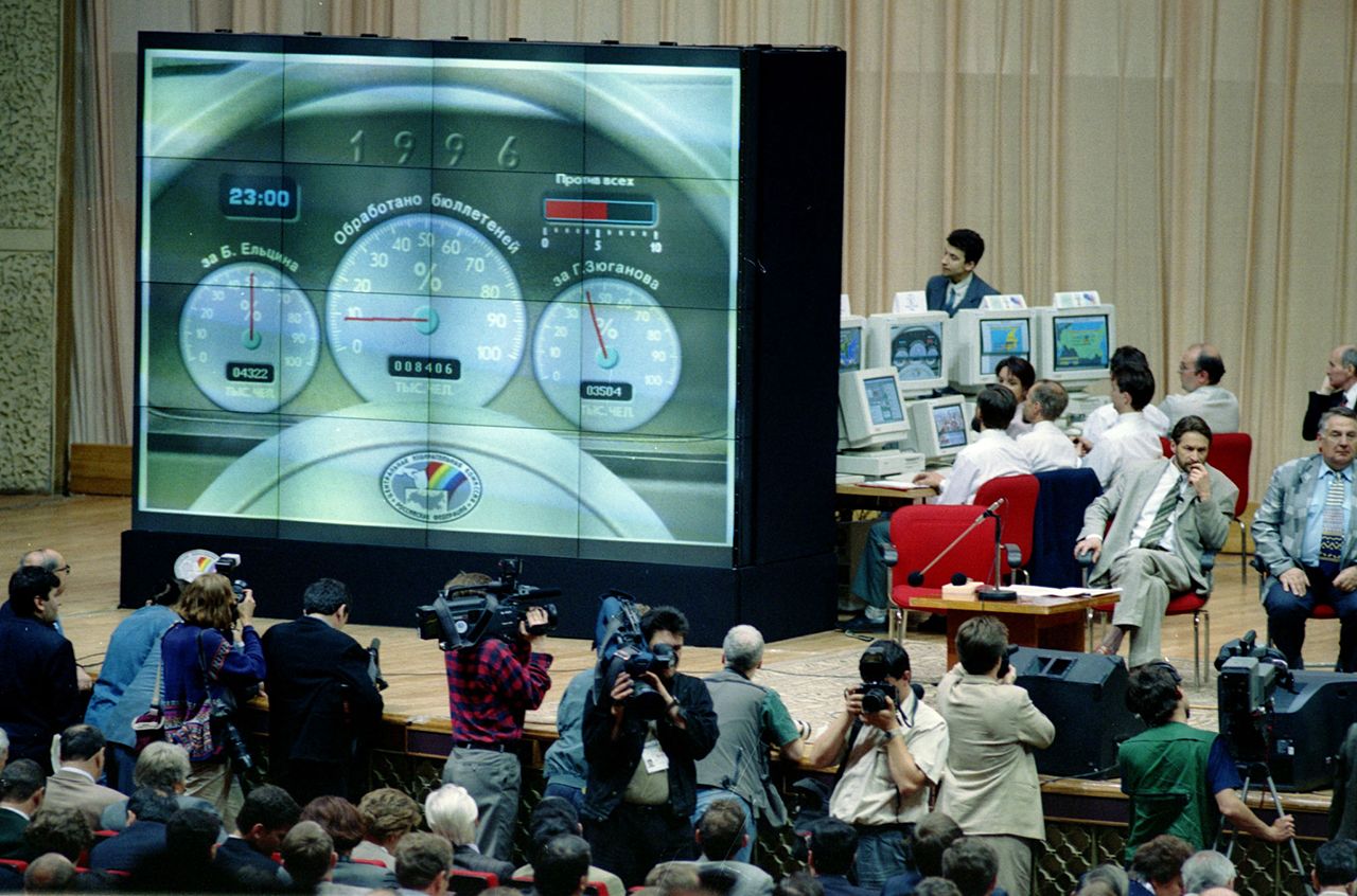 Борис Кавашкин / ТАСС Ночь после второго тура президентских выборов в пресс-центре Центризбиркома: экраны показывают цифры, свидетельствующие о победе Ельцина. 3 июля 1996 года