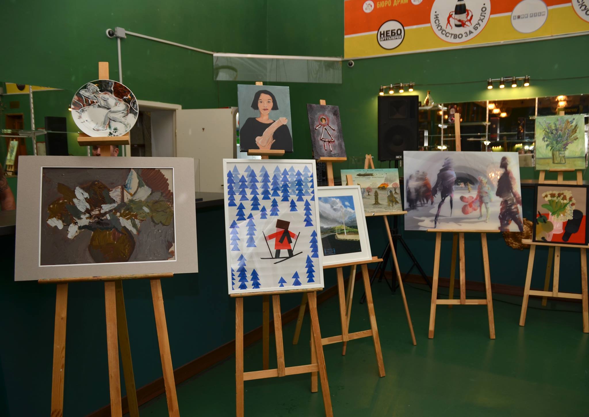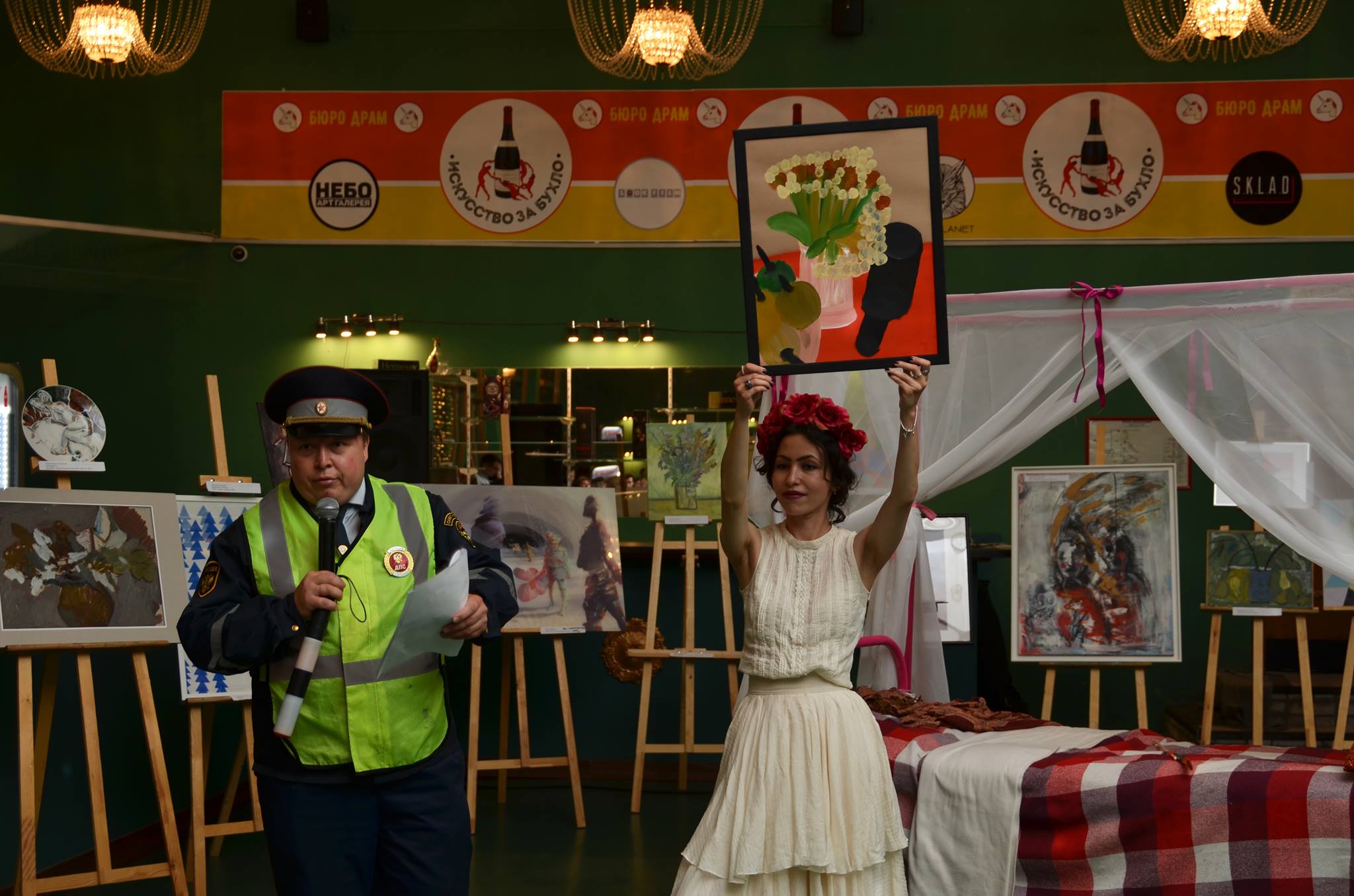 Одним из самых дорогих лотов стала картина акциониста Алексея Кирьянова «Бокал красного вина никому не повредит!»: за нее отдали три бутылки виски. Картину Алеси Лялюши «Девочка», нарисованную на IPad Pro, продали за 8,5 бутылок игристого вина.