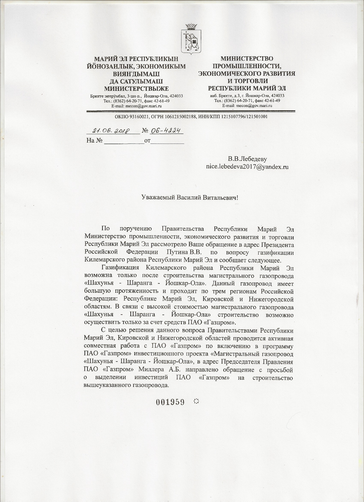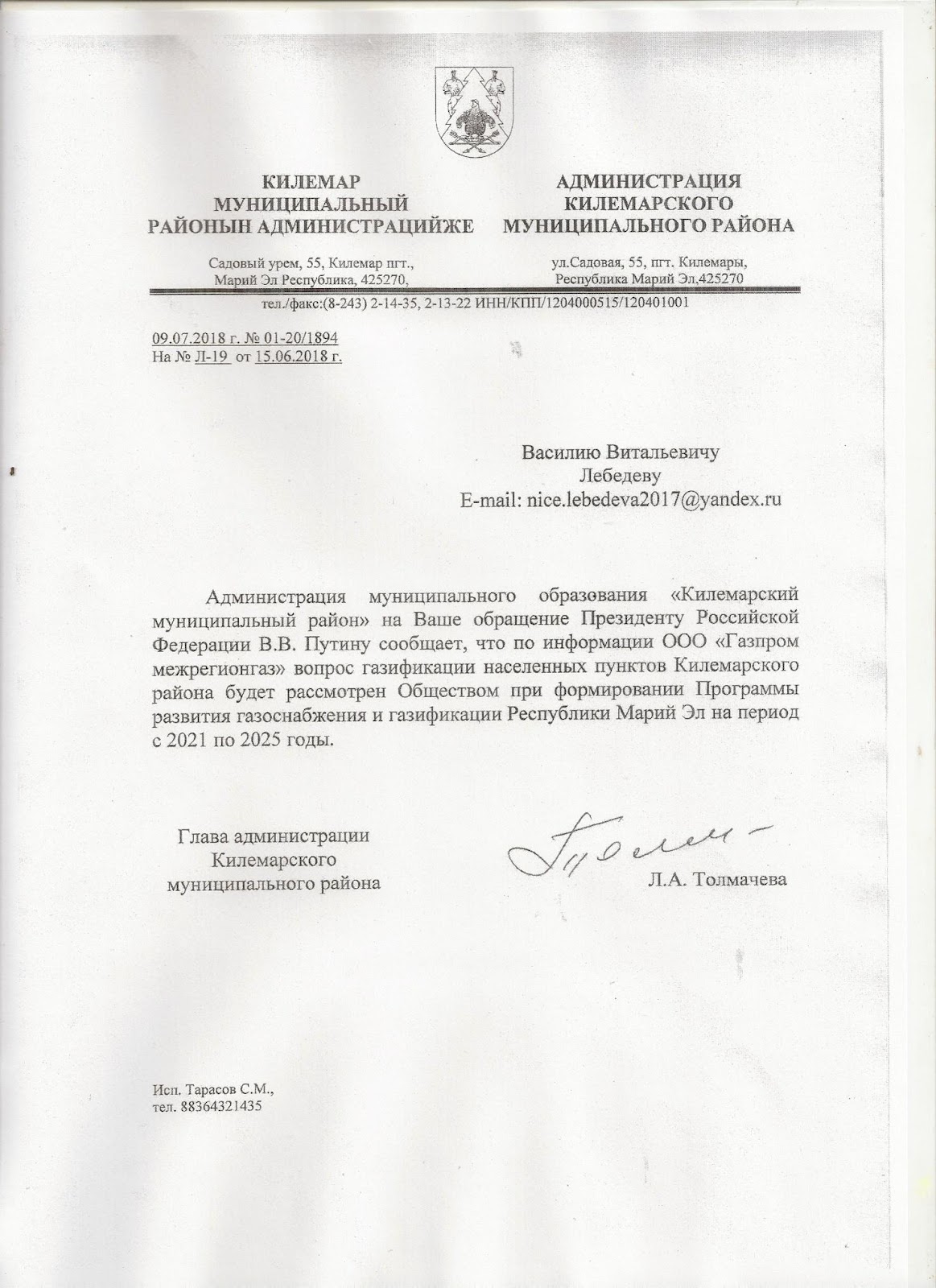 В масштабах государства моя просьба просто никчемна . Да и ваш ставленник Евстифеев А.А. ,когда посещал наш район 16.08.17 года , обещал ,что возможно, газ будет . Но это только возможно, так как нужны перспективы и предприятия для того, чтобы газовые компании вложились в проведения газа в наш район. Но всего этого нет и , увы, не будет! Все, что осталось нам от СССР уничтожено на корню. Нет ни сельского хозяйства ,ни лесной промышленности. Нет вообще ничего !!! Также прошу не отсылать мое письмо в республику в наше правительство. Я не хочу повторения прошлого года , когда после написания вам письма , на меня 6 раз пытались завести уголовное дело. Если не можете помочь, так и отвечайте, что не можете помочь провести газ в район . С уважением Лебедев В.В.