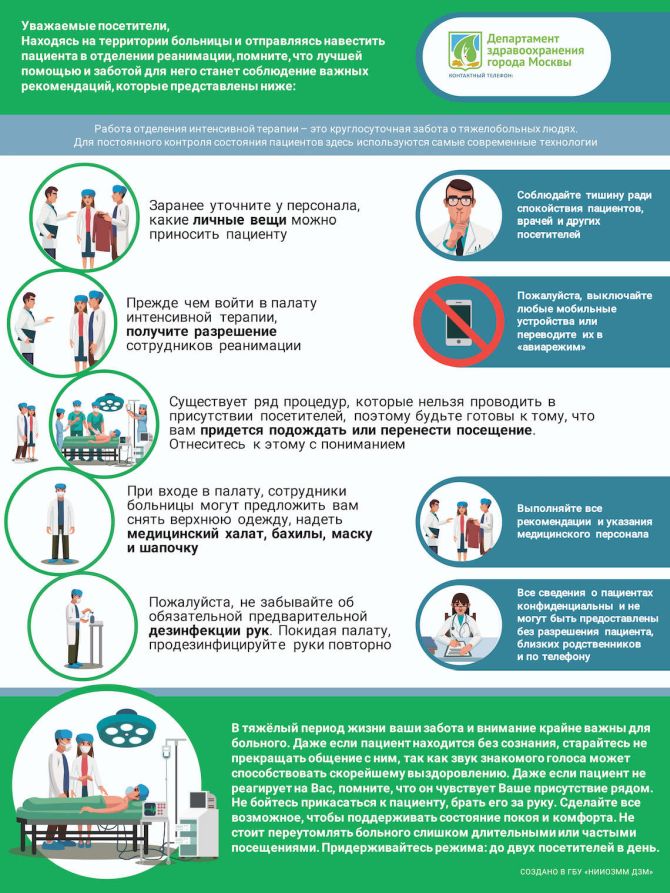 Ведомство напоминает, что «отдельные манипуляции и реанимационные мероприятия не допускают присутствия посетителей», также необходимо соблюдать тишину и чистоту. Поэтому родственникам придется переодеваться в специальную стерильную одежду, а посещать пациента можно будет лишь в одиночку или вдвоем.