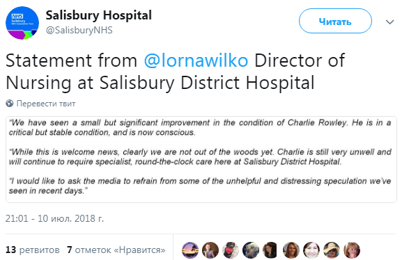 Подвергшийся воздействию отравляющего вещества «Новичок» Чарли Роули пришел в сознание.