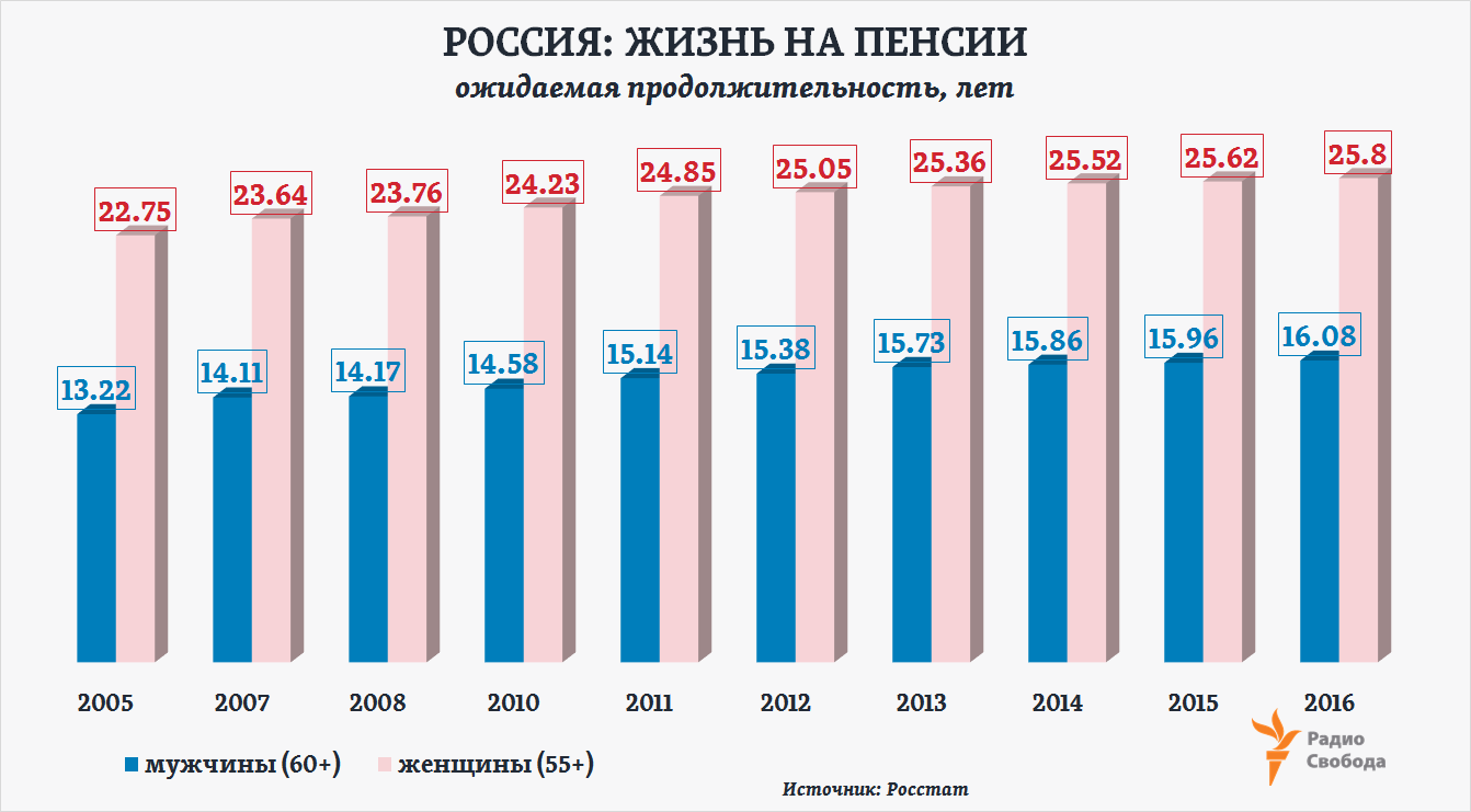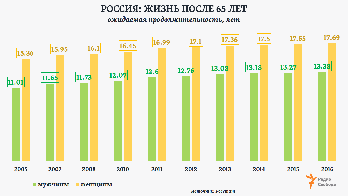 В среднем по России для мужчин и женщин, достигших 65-летнего возраста, период ожидаемой продолжительности жизни, по данным Росстата, составил в 2016 году ровно 16 лет. Для сравнения, в 2010 году – 14,73 года. То есть за шесть лет он увеличился лишь на год с четвертью.