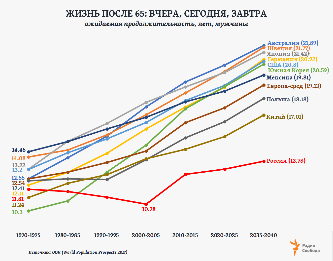 И, скажем, согласно той многолетней статистике, которую ведет отдел народонаселения Организации объединенных наций (ООН), и его же прогнозам, во второй половине 30-ых годов ожидаемая продолжительность жизни 65-летнего мужчины в России составит около 14 лет, то есть почти в полтора раза больше, чем предполагают расчеты на основе текущих темпов повышения среднего возраста смертности: