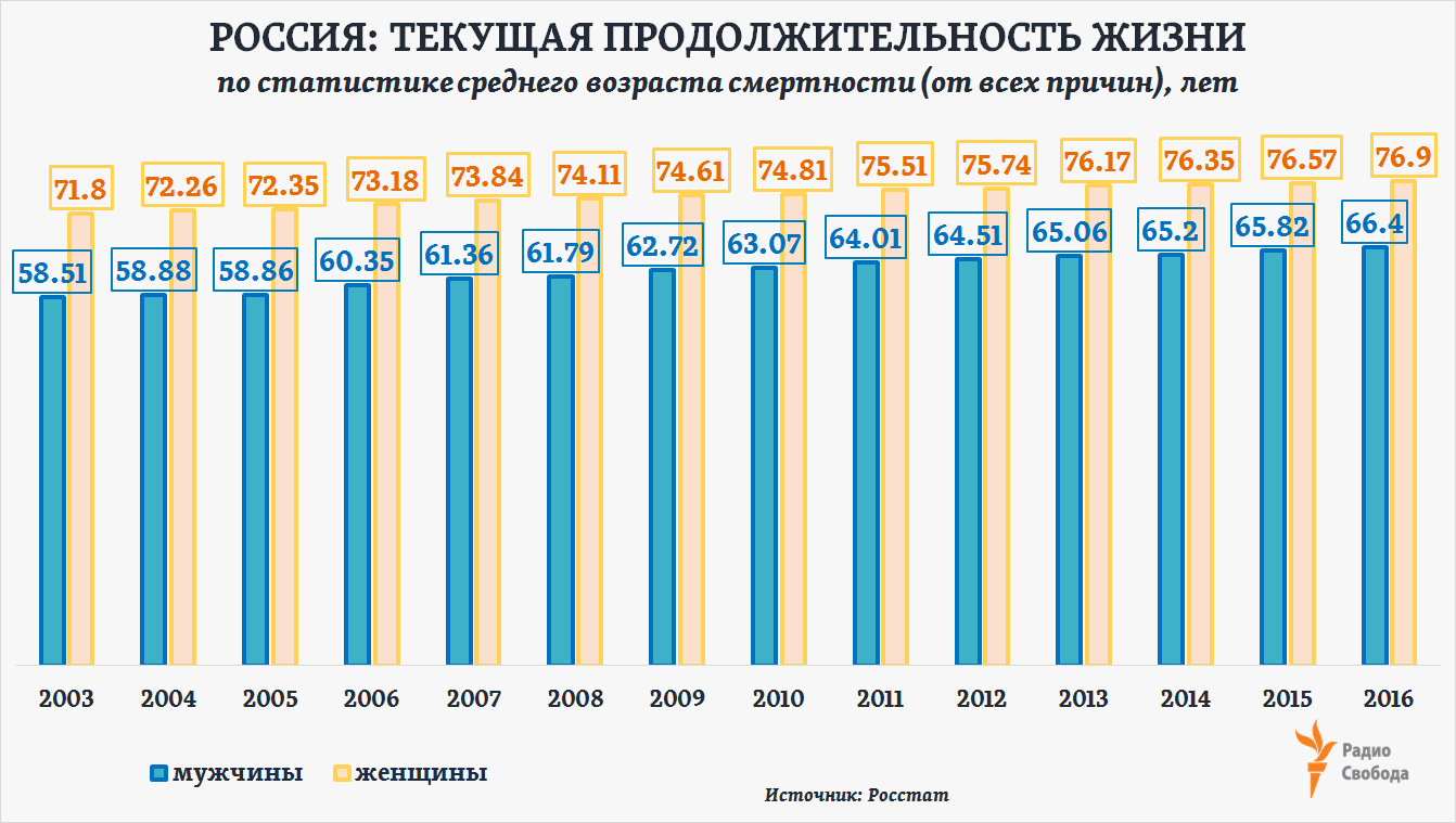 В основе любых расчетов ожидаемой продолжительности жизни в той или иной стране – статистика смертности по полу и отдельным возрастным группам, включая и средний возраст смертности. В России с 2003 года такой “средний” возраст для мужчин повысился на 8 лет, для женщин – на 5 лет: