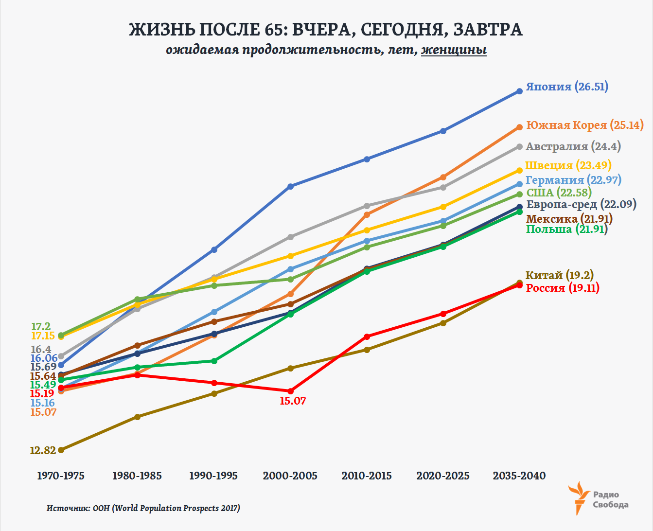 Для женщин в России, достигших 65-летнего возраста, эксперты ООН прогнозируют ко второй половине 30-ых годов более 19 дополнительных лет жизни. По логике, для 63-летних – 21 год: