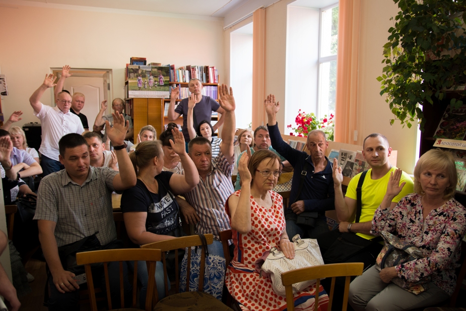 Администрация поселка организовала публичные слушания по инициативе застройщика в читальном зале медведевской библиотеки, рассчитанном примерно на 10 человек. Но на собрание пришло 23 человека, работникам библиотеки пришлось искать дополнительные стулья.